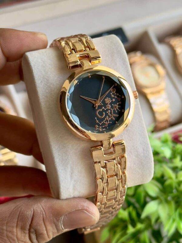 This elegant rose gold watch exudes sophistication with its intricate floral design and shimmering finish, making it a perfect blend of style and grace.