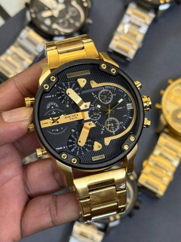 This Diesel watch stuns with its bold, multi-timezone design, striking gold accents, and rugged elegance.