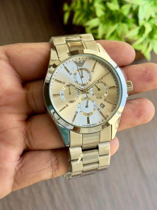 This stunning gold-toned watch exudes elegance and sophistication with its sleek design and intricate dial details.